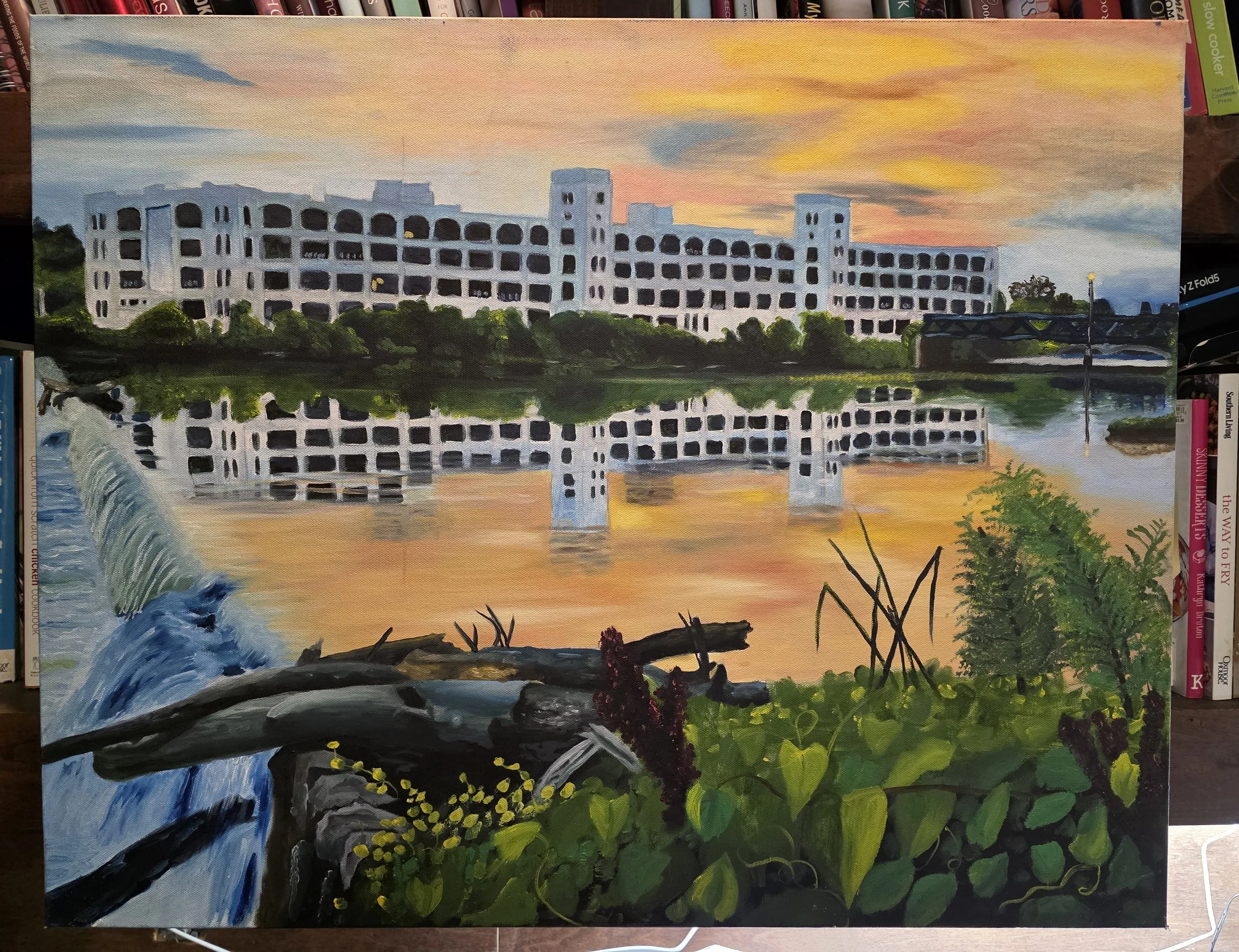 Original 24x30 oil painting showcasing the iconic white mill in Danville’s River District.